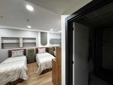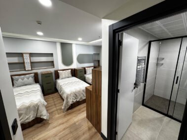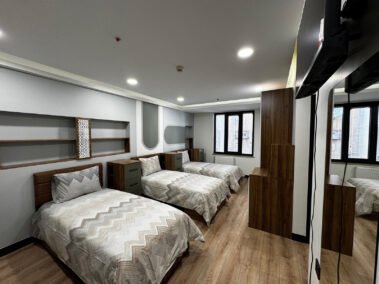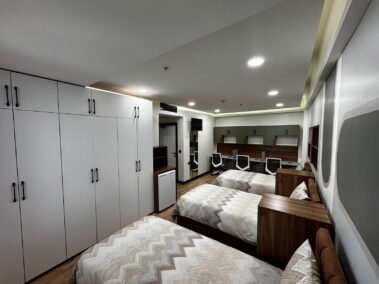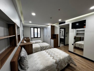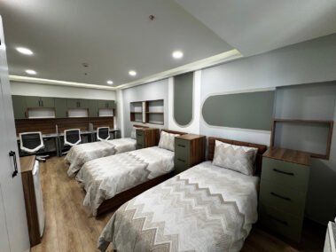 Samimi ve sıcak bir ortam isteyen öğrenciler için üç kişilik odalar mükemmel bir tercihtir. Paylaşımlı yaşamın keyfini çıkarırken aynı zamanda ihtiyaç duyduğunuz konforu bulabilirsiniz. Odalarda klima, televizyon, buzdolabı, banyo ve tuvalet yer almaktadır. Balkonlu seçenekler sayesinde ferah bir yaşam alanı elde edebilirsiniz. Yatakların özel çekmeceleri, eşyalarınızı düzenli tutmanıza yardımcı olur.